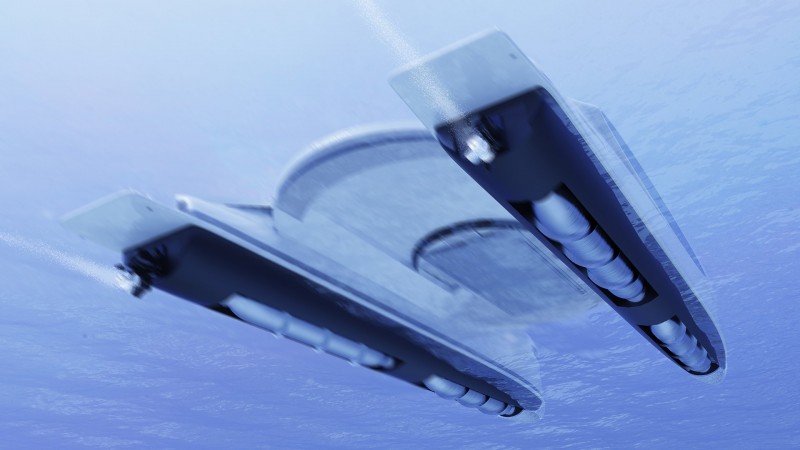 兩具890hp柴油引擎在水上的最大速度24節,巡航速度18節,純電動模式最高速度6節。在船體底部兩邊各自設置兩個各6.5公尺的螺旋圓柱鋼體,每個鋼體都與一個獨立的引擎互連,引擎與變速箱相連,在水摩擦力的作用下,螺旋鋼體可為船上的電池充電。