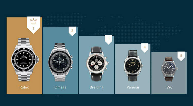 ▲Chrono24站內二手錶價位介於台幣15萬~20萬出頭(美金6,000~8,000元)最受歡迎的5個品牌。Source:Chrono24
