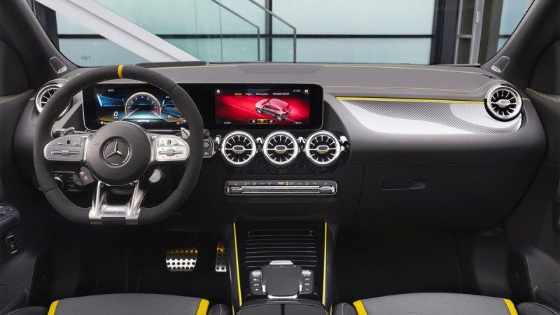 賓士AMG GLA 45 S 4MATIC+車室裡可見儀錶板和腰線上的黃色車縫線,表現無法忽視的AMG賽車氛圍。搭配配備換檔撥片和操控按鈕的專屬 AMG 高性能平底跑車方向盤,可快速且安全地操作特定的行駛動性功能,確保專注且以性能為導向的駕駛體驗。透過 AMG DYNAMIC SELECT 控制鍵可切換各種駕駛模式,GLA 45 S 4MATIC+ 專有的「RACE Mode」賽道模式,具有最短換檔時間、超即時的油門反應和最貼近跑車的懸吊設定,更能享受強勁快感。