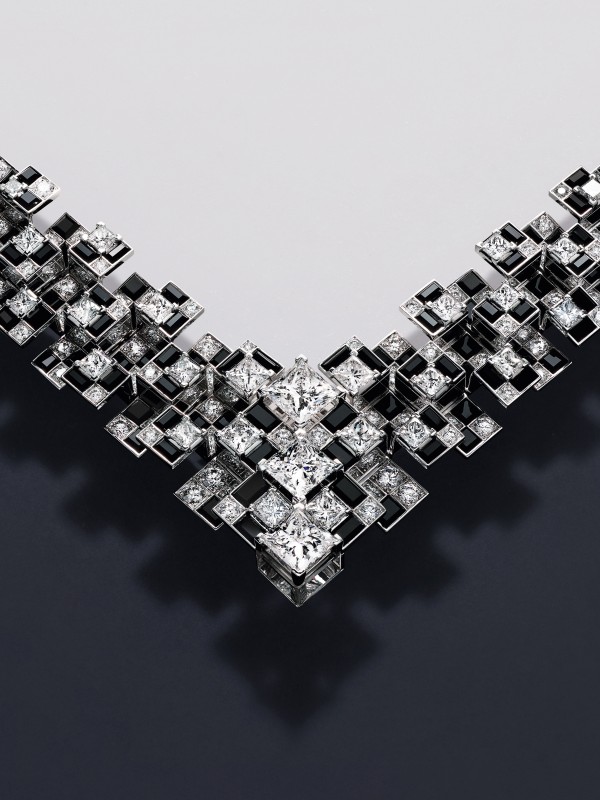 以馬賽克鑲嵌手法,鑽石、縞瑪瑙和天然水晶勾勒出教人目眩神迷的棋盤圖案。除了透視法引起的錯覺,更有鏡面拋光金屬與幾何縞瑪瑙之間的材質玩搭與反光作用。寶石似乎無限擴大,呈現立體感的作品讓光學效果更加引人入勝,每個元素與其毗鄰元素的高度各有不同。