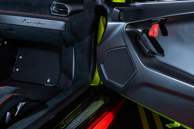 Huracán STO內裝設計與靈動輕巧的車身更顯相得益彰。猶如賽車駕駛座艙,車內配備防滾架與四點式安全帶與可收納賽車安全帽的前置物空間;碳纖維材質可見於車內多處,包含:碳纖維賽車座椅、取代傳統腳踏墊的碳纖維腳踏墊以及帶有車門開關的全碳纖維車門內飾板等。採用鈦合金材質打造而成,Lamborghini與技術合作伙伴 Akrapovič 共同研發的防滾架,相較傳統不銹鋼材質重量減輕達 40%,釋放Lamborghini Huracán STO 自賽道而生的純粹DNA。