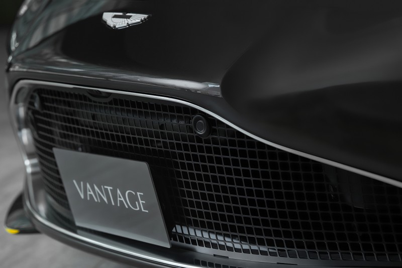 ASTON MARTIN Vantage繼承Vantage V8 坎伯蘭灰Cumberland Grey車色,搭配鋁製水箱罩外框與聯名特仕款獨有的黑色方格水箱護罩,巧妙揉雜新生代Vantage獵手風範與Vantage V8經典元素。聚焦於車側,呼應水箱護罩的專屬方格黑砂面導流鰭片與特製「Vantage」字樣徽飾相互搭配,細節盡顯007特仕車獨有氛圍。