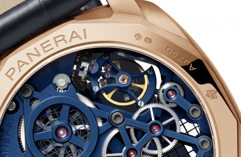 錶背透明底蓋露出機板、夾板同樣都鍍成藍色的P.2005/T機芯,這枚機芯不僅陀飛輪裝置的位置以及運作模式都很有個性之外,還帶有沛納海獨家的鏤空風格——正、反面均擁有網格狀的鏤空造型,看起來別具前衛科技風。且P.2005/T機芯除了陀飛輪裝置外,還兼具兩地時間、日夜顯示與動力儲存顯示等豐富功能;陀飛輪裝置的設計有多細緻講究呢?其實從沛納海細心挑選它的材質便可見一斑,其零件主要以鈦金屬製成,讓整枚陀飛輪裝置的重量得以降至23克,間接有助於減低機芯的能量消耗,從而鞏固腕錶的走時精準度。