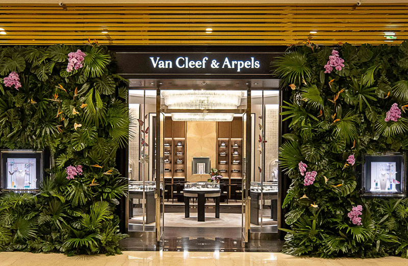 走入Van Cleef & Arpels信義旗艦店,盛開的蘭花、火鶴、天堂鳥及嫩葉宛若瀑布般生機盎然的攀附於店外牆面,不僅體現世家與花卉的美妙奇遇,也將這份歡愉體驗分享給大眾。百貨商場內的精品店牆面至店內的延伸設計,都貫徹藝術家匠心獨具的花卉自然圖騰,鉛筆和油性粉彩掛畫、翩然飛舞的蝴蝶、繽紛的花器,為訪客提供極致感官盛宴。