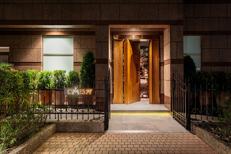 CIMES代表頂峰,也表示越向上,離星星的距離越近;也彷彿長途攀登的勇氣,勇於踏上實現夢想創造摘星故事的旅程。邁向巔峰的過程,君子需要靜謐的穴居調養生息,在這裡追求原味、講求真味,用原始天然滿足人類對吃食的需求。推開兩百多公斤厚實的杉木大門,洞穴裡的天地豁然開展,高雅樸實中點綴星空閃爍,岩石孔洞意象貫穿全場,金屬鏽蝕鐵板,質地透出沈沈的礦橘色,流暢的弧角和大大小小穿透的孔洞,隱喻岩石層層堆積與主廚科學料理概念,都是由一顆顆細胞經年累月所組成。17席橘色高腳座椅,圍繞主廚展演的中島開放廚房,25坪空間,賓客和主廚都是穴居中流動的要角。此外,高硬度石英石桌面、加高模石子腳踏,方便置放包包的布閣、玫瑰金馬賽克洗手間,搭配不同氣氛的旖旎燈效,從氛圍到使用的流場度,在在都可感受設想周到的巧思。