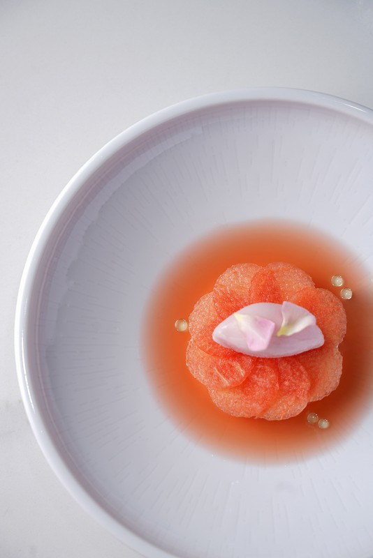 台灣傳統橢圓形的大西瓜就是華寶西瓜,又甜又冰,一吃暑氣全消。底層白色的荔枝冰糕包藏西瓜白玉、荔枝肉還有小薏仁,精巧疊上西瓜圓片和自製的嫣紅色玫瑰雪葩,緩緩注入西瓜冷湯,彷彿盛夏在湖水綻放的紅荷花,季節感十足,以甜點巧妙勾起兒時童趣回憶。
