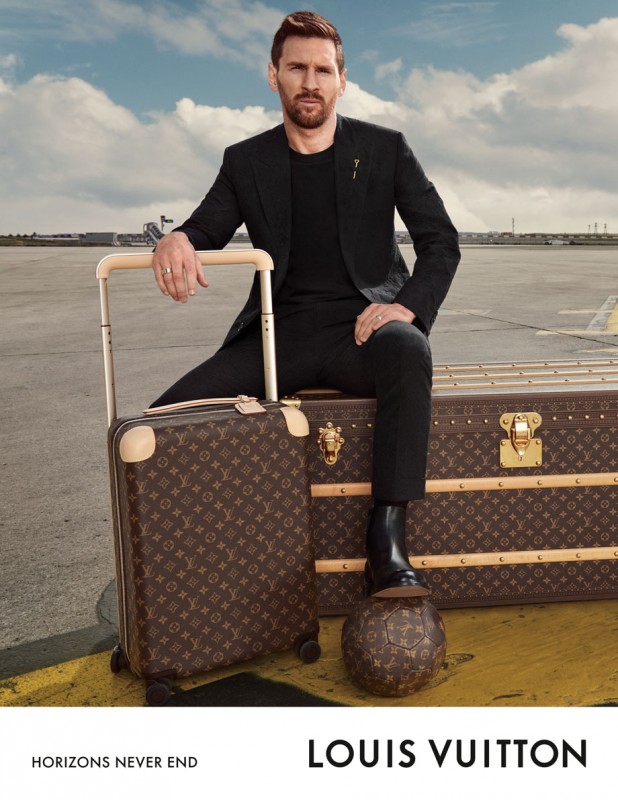 萊昂內爾·梅西 (Lionel Messi) 與路易威登展開一段Horizon行李箱的旅程故事,這也是他旅途中的唯一指定伴侶。在著名攝影師兼製片人格倫·盧奇福德 (Glen Luchford)的鏡頭語言下,這位足球界的超級巨星坐在候機大廳內,將雙腿伸直於Horizon 滾輪行李箱上;另一張照片則是在偌大的停機坪中間,梅西坐在路易威登標誌性的硬箱上,露出蓄勢待發的飛揚神態,提著他的 Horizon 行李箱準備前往遠方探險;腳踩Monogram足球,梅西足球場上英姿煥發的神采淋漓展現。