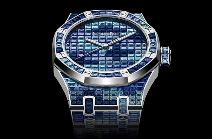 ▲愛彼2024年新推出鑲有彩色寶石的皇家橡樹自動錶,並呈現出令人耳目一新的迷彩圖案效果。