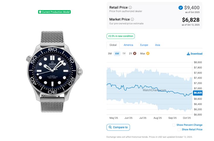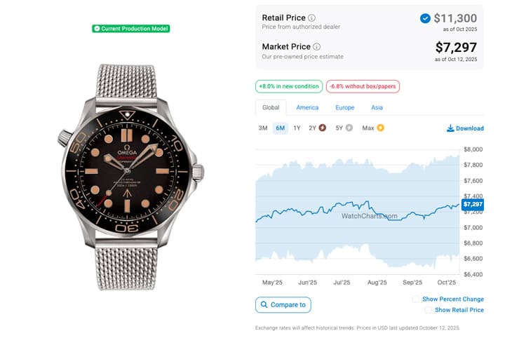 根據高級手錶市場調查研究機構WatchCharts的資料,007主題的海馬潛水300米似乎更接近我們對一般歐米茄手錶的二級市場價格印象。比較早出道的210.90.42.20.01.001(007限定款)也許是因為行銷操作上幾經波折的影響,加上它的定價又超過系列基本款許多,所以這款錶即使是在熱門錶行情巔峰的2022年初也沒有趁勢暴漲上去,差不多就是維持在定價線以下一點的距離,而經過熱門錶行情撞牆期這三年多來的連番跌價後,210.90.42.20.01.001(007限定款)在2025年4月左右的行情已經剩下7,075美金(約合台幣21萬7),加上中間歐米茄也曾調漲過手錶定價,導致它看起來折扣空間也拉大了。另一款210.30.42.20.03.002(龐德電影60週年紀念款)相較之下還是比較夯——這裡指的是以定價和二級市場行情相比,它在2025年4月時的二級市場價格達到7,143美金(約合台幣21萬9),不過這時候就已經跌破定價一陣子了。