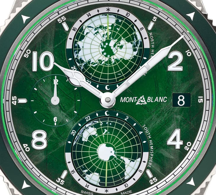 首先看到三款錶中功能最複雜的1858系列Geosphere世界時間零氧手錶,它的不鏽鋼錶殼搭配綠色陽極氧化鋁錶圈,至於面盤格局相當豐富,呈現出會轉動的南半球與北半球地球儀、24小時刻度、晝夜指示、兩地時間顯示,以及日期顯示等,錶款底蓋以雷射刻出白朗峰山脈浮雕圖像,並用氧化作用、霧面和拋光處理,讓浮雕可以富有深淺色澤,看起來像是把照片鑲在錶背般逼真,同時在山脈浮雕的下方,品牌還加上了被羅盤方位和兩把交叉的冰斧包覆的六芒星圖案,強調1858系列主打的登山精神。