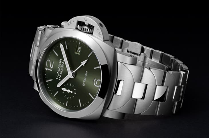 最後看到的是Luminor Quaranta BiTempo PAM01640,這款錶也是不鏽鋼材質,當然錶殼、錶圈和鍊帶都是用這種金屬製作,至於手錶面盤則是綠色太陽放射紋,搭配白色的夜光塗料,至於面盤的時、分、小秒和兩地時間指針都是銀色,顯得一副清爽俐落的風格。而這款錶面盤6點方向印有"BiTempo"字樣,這點相較於前面幾款稍微特別,這是義大利文的「雙時區」意思,直接突顯出手錶在功能性上的特點,也是現在被公認最實用的手錶功能之一。