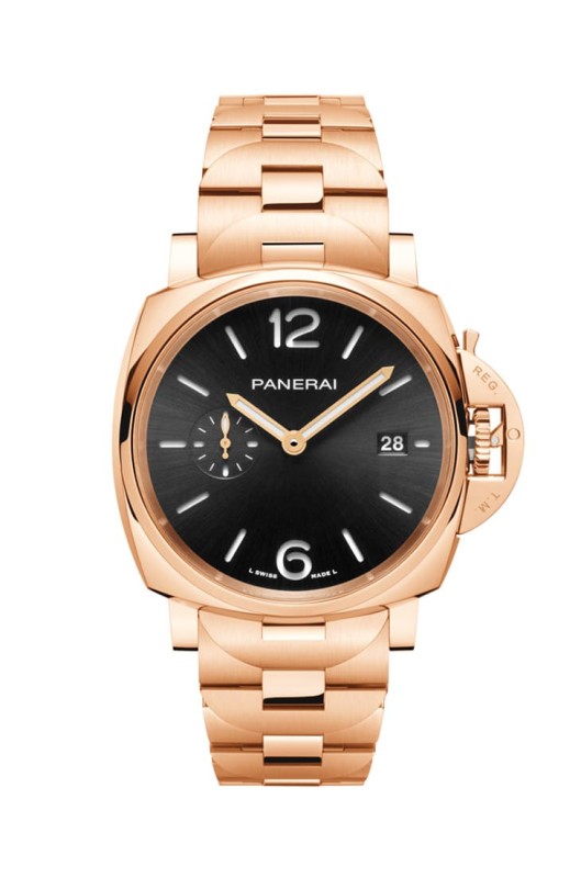 Luminor Due系列另有兩款Goldtech™紅金款式,分別是Luminor Due TuttoOro PAM01494與PAM01442,它們的錶徑都是42mm,從錶殼、錶圈到鍊帶全以Goldtech™紅金製成。PAM01494的面盤是白色太陽放射紋配米白色夜光塗料,PAM01442又換成黑色太陽放射紋配白色夜光塗料,有別於前面提到的三只不鏽鋼Luminor Due一律採用實底蓋,貴金屬款式的Luminor Due鍊帶錶則擁有透明底蓋設計,讓人可以好好欣賞手錶內部的P.900自動機芯。
