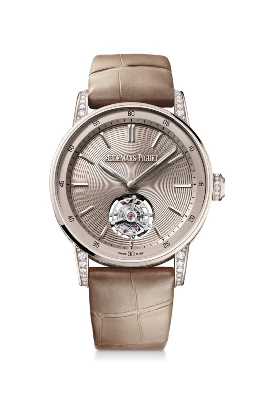 全新CODE 11.59自動飛行陀飛輪是38mm款式,以18K沙金及明亮式切割美鑽打造,此款是愛彼38mm錶款中首款自動上鍊飛行陀飛輪作品。其內含超薄RD#3機芯(2968機芯),糅合精緻美學與尖端性能。錶款傳承AP製錶理念,集傳統工藝、尖端科技、精緻設計於一身,為新一代小尺寸CODE 11.59系列複雜作品揭開序幕。