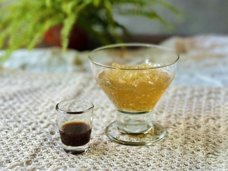 ▲手洗阿里山愛玉融入東方美人茶冰沙,再淋上陳釀梅汁與巴薩米克醋調和的黃梅露。