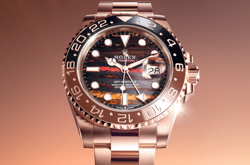 鐵虎眼石是由虎眼石、紅碧玉與赤鐵礦交織而成,帶來極其迷人的色彩流動感,表面呈現金棕色、紅橘光澤與灰黑礦物紋理在光線下閃爍變幻,每一枚面盤都如同天然藝術品,沒有任何兩塊會完全相同。傳統上勞力士運動錶的面盤大多採用黑色或單色系,而這次鐵虎眼石的運用,等於打破了長久以來的慣例,它將大自然的原始力量直接帶上手腕,與玫瑰金錶殼相互呼應,形成一種既奢華又具異國情調的氛圍。面盤上的時標與指針同樣以永恒玫瑰金製作,並填入Chromalight夜光塗層,確保夜間仍清晰易讀,3點鐘方向的日期窗搭配經典小窗凸透鏡,延續了GMT-Master II 的易讀性傳統,這種兼顧實用性與特殊性的設計,正是勞力士設計的獨到之處。