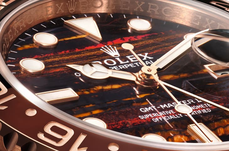 ▲面盤採用天然鐵虎眼石,融合虎眼石、紅碧玉與赤鐵礦,紋理獨一無二,外觀呈現橘與紅色調交織,帶來奢華異國風情,為GMT-Master II注入極具辨識度的美感。