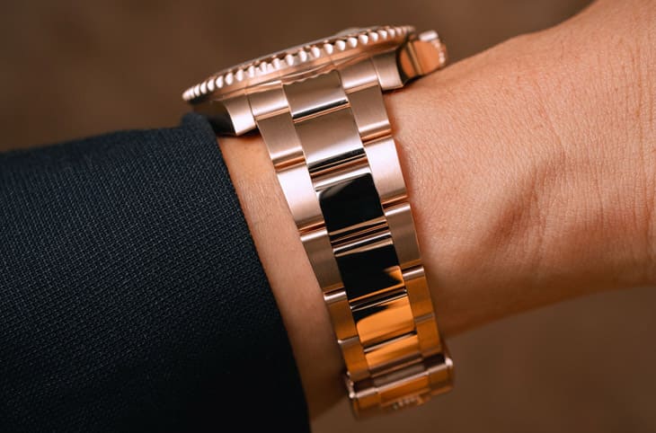 40mm蠔式錶殼不僅展現出穩重氣勢,還提供100米防水,搭配三扣鎖錶冠,形成堅固可靠的結構,雙色Cerachrom陶瓷錶圈則延續了經典麥根沙士配色,亦即棕與黑的過渡,象徵日夜交替。陶瓷不僅耐刮抗蝕,數字與刻度更以PVD技術鍍玫瑰金,細節既奢華又低調。鍊帶採用蠔式三格鍊節設計,中間鍊節拋光、外側磨砂,邊緣則精緻拋光,營造層次分明的質感,再加上內置陶瓷組件提升耐用度,以及摺疊蠔式保險扣與Easylink延展系統,讓佩戴舒適度和日常便利性都達到高水準。勞力士在這款錶上,一方面保留了GMT-Master II一貫的專業感,又透過玫瑰金與陶瓷的搭配,營造出一種不張揚卻極具格調的奢華感,它不是過度誇張的浮華,而是耐看、穩重、持久的細膩質感。