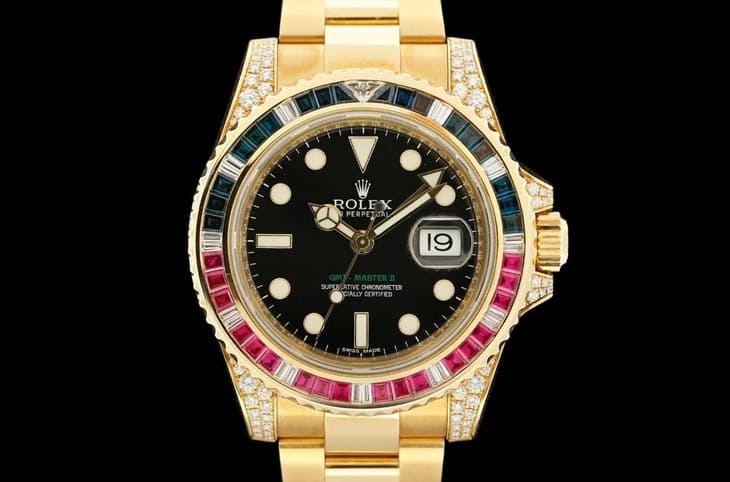 ▲116758SARU以黃金打造,鑲嵌紅藍寶與鑽石圈,象徵勞力士頂級製錶與珠寶工藝的融合。Source:Chrono24