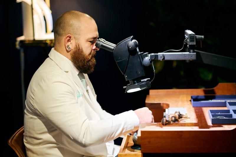 延續對自然與生命的致敬,展覽也特別聚焦於傳奇設計師 尚・史隆伯傑Jean Schlumberger的經典創作「Bird on a Rock 石上鳥」。自1965年問世以來,這隻靈鳥棲息於寶石之上的意象,早已成為高級珠寶史上最具象徵性的設計之一。此次展區更邀請來自美國的首席珠寶工藝培訓師Lucas現場親自示範「石上鳥」胸針的鑲嵌技法,讓觀者得以近距離感受Tiffany的卓越工藝與巧思。