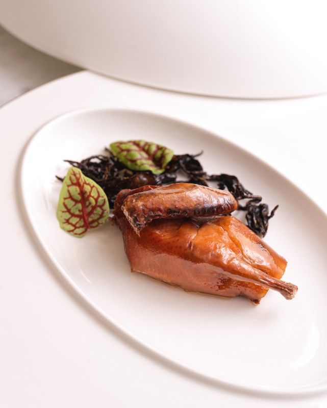 對主廚王國政而言,料理講究的不只是火候,更是對時間的精準掌控。其中〈舞鶴紅茶乳鴿〉便是最具靈魂的一道,這道菜選用僅22天的初生乳鴿,以花蓮舞鶴紅茶為基底滷製入味後風乾,再以小火慢炸,使外皮薄脆、肉質細嫩。上桌前輕噴紅茶茶油,茶香、蜜香與肉香在熱氣間交織,香氣豐富而不濃烈。酥香的皮與鮮嫩的肉在口中交融,留下溫潤卻明亮的餘韻。
