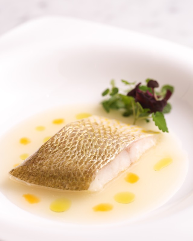 與一般的辛辣川菜不同,〈藿香黃花魚〉則讓人重新理解川菜中的「清香系」哲學。王主廚以低溫慢煮保持魚肉的細嫩與水分,再以紫蘇、薄荷與大葉提煉出藿香的草本香氣,最後加入花椒與木薑子油提味。這道菜沒有過度的辛辣或厚重調味,反而以乾淨的香氣與細緻的油脂平衡帶出鮮甜。這樣香而不膩、清而不淡的風味,尾韻中帶著微麻與草本的清爽,輕盈卻讓人印象深刻。