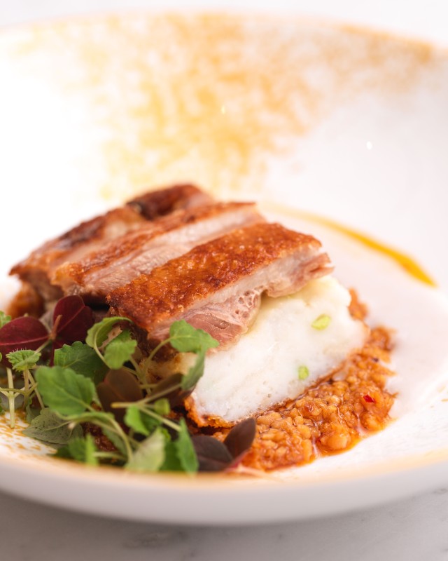 靈感來自粵菜「江南百花雞」,〈豆酥神仙鴨〉是王國政主廚展現火候功力的代表作,其將香料醃製的櫻桃鴨腿與以龍膽石斑、墨魚打漿的海鮮漿體結合,打造外酥內嫩的雙層口感。鴨腿經過旱蒸定型後酥炸,再以快炒豆瓣與豆酥堆疊出厚實香氣,最後以滑順的芋泥醬收尾。辛香與甘醇相互平衡,香氣層層推進,入口後留有淡淡豆香與海味的融合滋味。