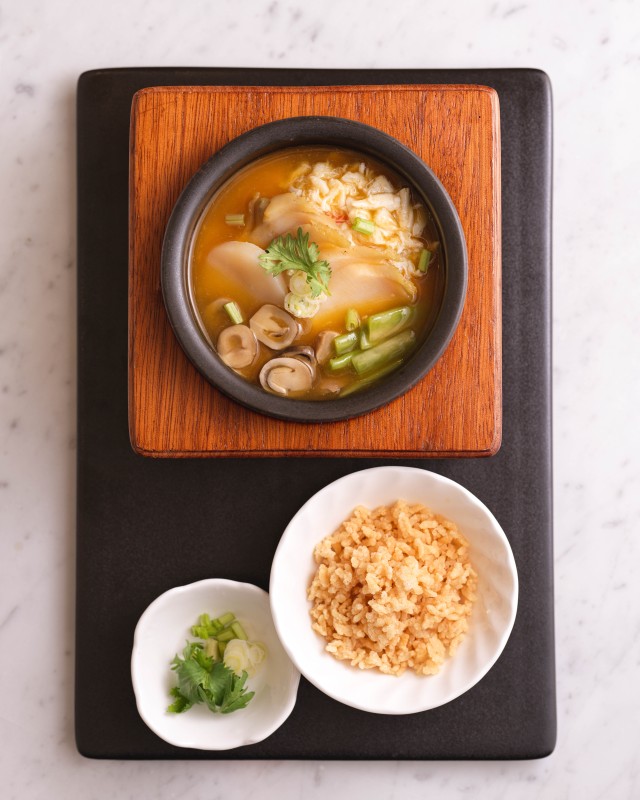 〈酸湯蟹肉泡脆米〉帶著傳承的意義,以王主廚親赴四川向松雲派代表性傳人張元富師傅學習經典菜式〈元富魚翅羹〉為靈感,將自製泡菜、番茄與豆瓣炒香注入豬骨高湯,熬成酸鮮澄亮的湯底,再搭配蟹肉、鮑魚、草菇與貢菜提鮮,最後撒上炸至金黃的脆米。入口時酸香與海味交疊,湯韻清亮而有厚度,微酸的氣息中藏著一絲花椒的暖意,重現正統川味的精神脈絡。