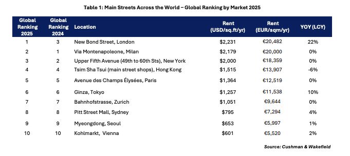 房地產公司Cushman & Wakefield戴德梁行35年來發布《Main Streets Across the World》(全球主要商業街),這份年度報告根據特定街道上商店的平均租金,選出高端零售業蓬勃發展的地區。2024年榜單第一為米蘭米蘭蒙特拿破崙大街( Via Montenapoleone),另一全球標竿紐約第五大道( Fifth Avenue)緊隨其後,第三名就是倫敦新龐德街。如今,米蘭蒙特拿破崙大街在2025年跌至第二位,因為其租金絲毫未漲,仍然維持在每年每平方英尺1666英鎊的水平。