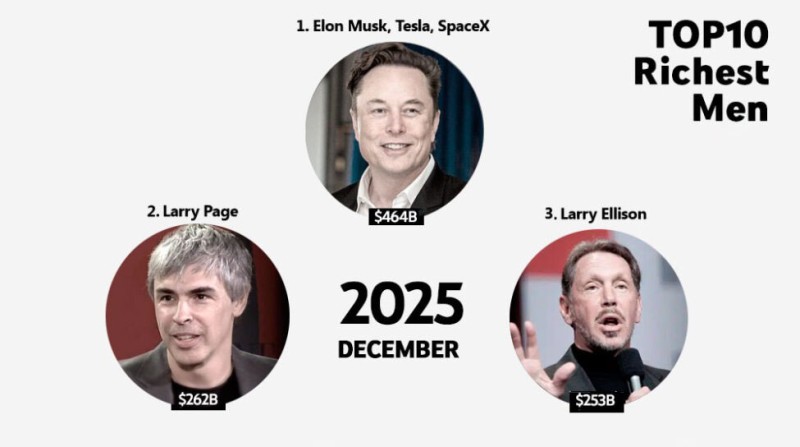 根據《富比士》世界億萬富翁排行榜,2025年一共有3,028位,財富總資產達16.1兆美元,比去年增加了247位、近2兆美元。整體來說「世界上最有錢的人」排行榜在2025年變化多端,特別是隨著AI人工智慧持續升溫、科技股價飆升,讓前十名名單偶爾洗牌又恢復,起起伏伏掀起變化。9月時甲骨文創辦人賴瑞艾里森(Larry Ellison)秒奪首富寶座,不到一天的時間又歸還馬斯克 (Elon Musk)。《富比士》另一個「即時億萬富翁榜」(The Real-Time Billionaires List),馬斯克居首不意外,但第二名竟然變成Alphabet(Google 母公司)共同創辦人拉里佩奇(Larry Page),因為Gemini 3的AI模型大受市場好評,身價暴漲14%,他才成為有史以來第二個富有的人。賴瑞艾里森則是位居第三,「黃爸爸」輝達共同創辦人、執行長黃仁勳是第八名。