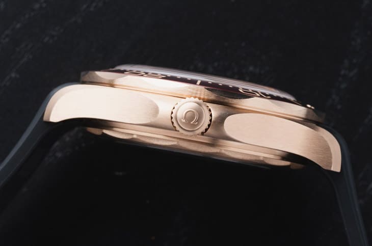 這款錶最大的亮點,莫過於歐米茄獨家研發的Bronze Gold青銅金材質,一般青銅錶雖然有魅力,但很多人怕氧化、不想袖口染上一片綠,青銅金解決了這些痛點,它包含37.5%(9K)黃金,加上銅、銀、鈀、鎵等金屬,使它呈現出介於青銅與玫瑰金之間的柔和金調,既溫暖又低調,不會隨時間變黑,也不會長綠鏽,就是為喜歡青銅質感卻不想面對「變色驚喜包」的人量身打造的夢幻材質。錶殼以全拉絲霧面處理呈現更深沉的工具錶氣息,不走高調、閃亮的路線,但是勃根地紅色陽極氧化鋁錶圈又很亮眼,深紅與暖金結合的視覺效果,猶如陳年紅酒般濃郁,有一種愈看愈耐看的韻味,歐米茄以往在海馬潛水300米系列從未使用過這種酒紅色調,這次的氛圍一推出就讓人直接聯想到復古運動錶的精緻氣質。其中搭配黑色橡膠錶帶款式整體重量控制得相當好,戴起來比鍊帶款更輕盈、更貼手,是那種不必「特別打扮」也能Daily Carry的高級休閒感。