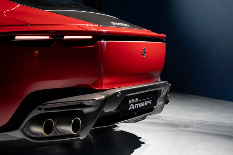 在外型設計上,作為 Ferrari Roma 的繼任車型,Ferrari Amalfi重新詮釋 V8 2+ 硬頂 Berlinetta 車型的經典設計理念,巧妙融合傳統與創新元素的設計語彙,重塑躍馬品牌的美學標竿。以雕塑般的立體曲面勾勒出一體式流線造型,展現動感純粹的美學力量,為整車賦予蓄勢待發的動感姿態。車體造型貫徹了「化繁為簡」的設計哲學,俐落線條與幾何美感十足的輪廓相互呼應,共同描繪出極具雕塑感的流暢車身。車頭拋棄傳統格柵設計,轉而在深色凹槽上方設計同色系的懸浮式前翼,下方區域的分流器則成為車頭設計的一大亮點,不僅在視覺上延伸了車體寬度,更進一步彰顯Ferrari Amalfi的運動基因。車尾造型採用同樣的設計理念,以一條鮮明的環繞式線條包覆尾部並延伸至車側,勾勒出簡潔俐落的輪廓。尾燈巧妙隱藏在幾何切口內,以現代設計語彙向 Ferrari 經典車型致敬。此外,為彰顯獨特個性,新車同時推出全新車色「Verde Costiera」以阿瑪菲(Amalfi)海岸的粼粼波光為靈感,這抹閃耀的藍綠色調隨車體曲面流轉,不僅強化雕塑般的立體感,更為整體設計注入充滿活力的氣息。