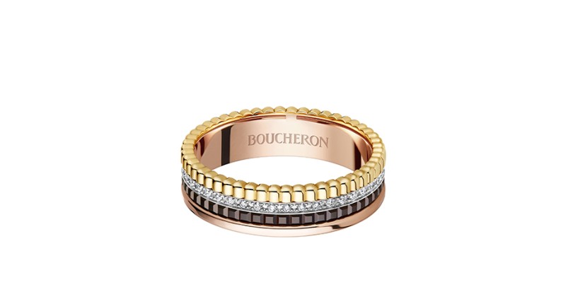 每一款經典設計元素,皆融匯精湛傳統工藝與尖端科技,由工匠大師耐心製作,臻於細節。Quatre系列戒指獨具魅力。戒指由四個截然不同的環圈組成,每個環圈皆獨立製作,再組裝成一體,流露出Boucheron寶詩龍獨樹一幟的美學魅力。
