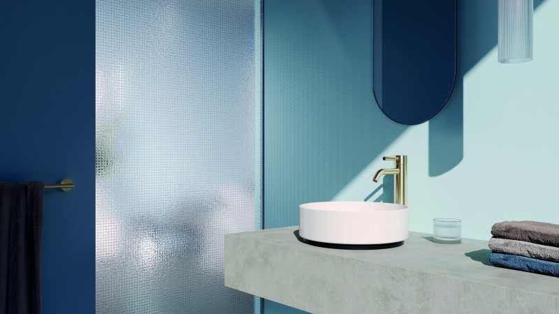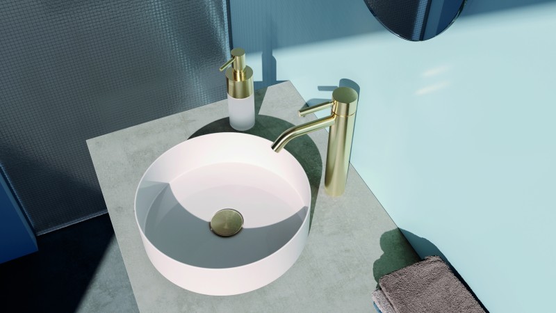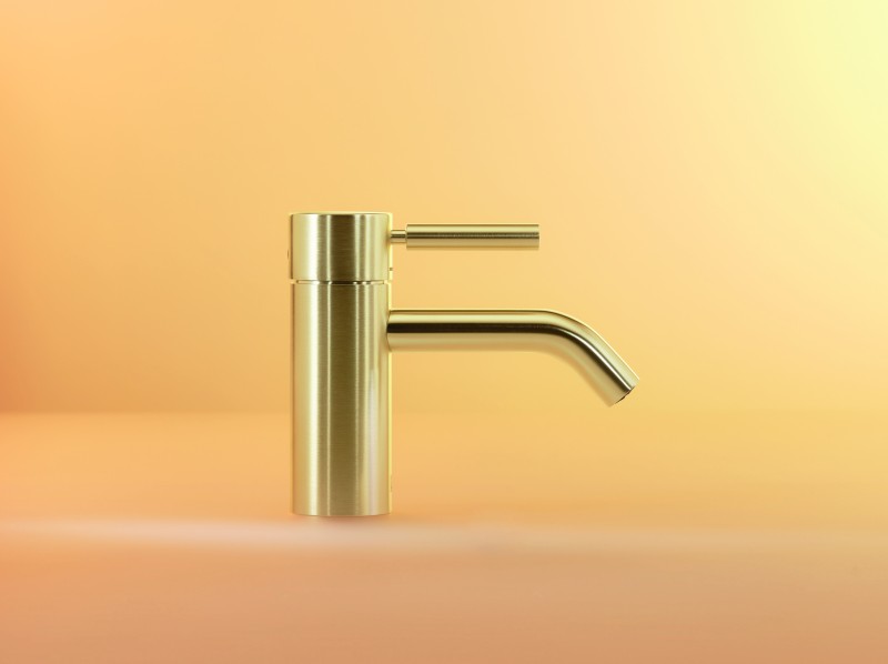 有別於傳統的亮面金色,新色採用了細膩的手工刷紋工藝,讓金屬表面呈現出柔和的霧面質感。在空間的色彩搭配上,刷紋淺金展現了極佳的包容度,意外地百搭有型。若喜歡沉穩洗鍊的風格,將金屬龍頭搭配冷灰石材檯面與霧藍色牆面,能形成和諧的冷暖對比;若偏好柔和的氛圍,將其與淺木質、米色礦物塗料或是粉紅色系磚牆搭配,則能襯托出溫潤的質感,成為洗手台區域最優雅的亮點。