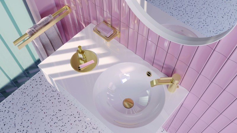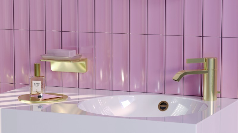 ▲Dornbracht IMO刷紋淺金色(Brushed Light Gold)龍頭細膩的手工刷紋於粉紅色設計襯托中更顯溫潤層次,為空間注入優雅且具當代感的視覺焦點。