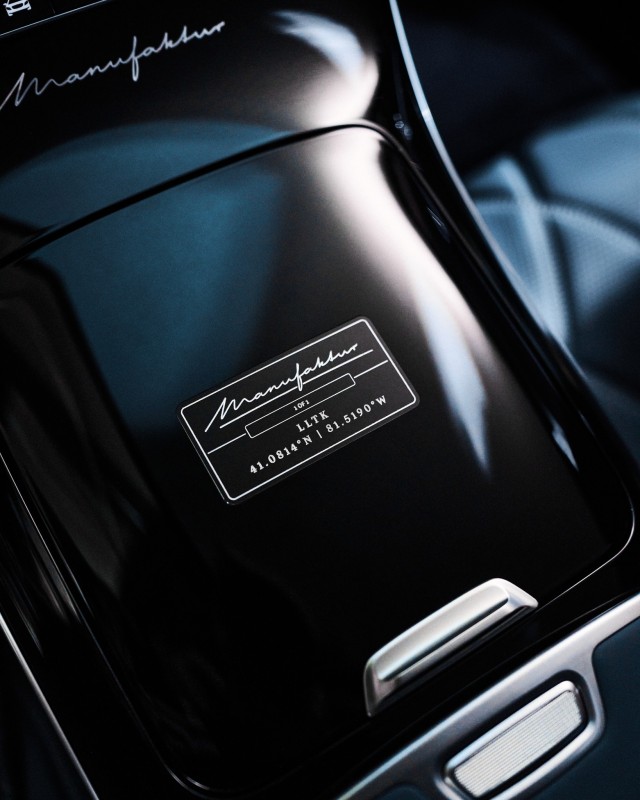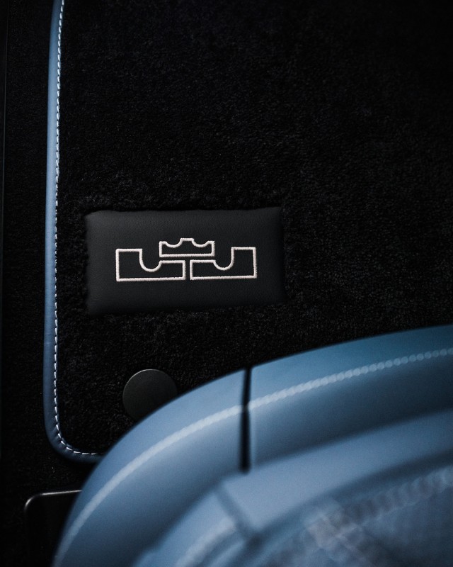 步入車內,這座移動宮殿的驚豔程度更上一層樓。深藍色的菱格紋 Nappa 真皮如同深夜的海域,包覆著每一寸觸手可及的空間,天篷則選用了頂級的 Alcantara 材質,營造出極致柔軟的觸覺包圍。最令粉絲津津樂道的,莫過於隱藏在細節中的「彩蛋」:座椅頭枕上刺繡著 LeBron 的專屬皇冠 Logo,而中控台則刻上了最具紀念價值的「1 OF 1」字樣與他出生地——俄亥俄州阿克倫(Akron)的地理座標41.0814°N、81.5190°W 。這不僅是一輛代步工具,更是他走到世界巔峰的奮鬥里程碑。