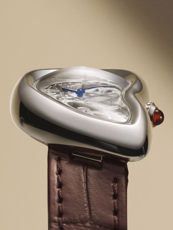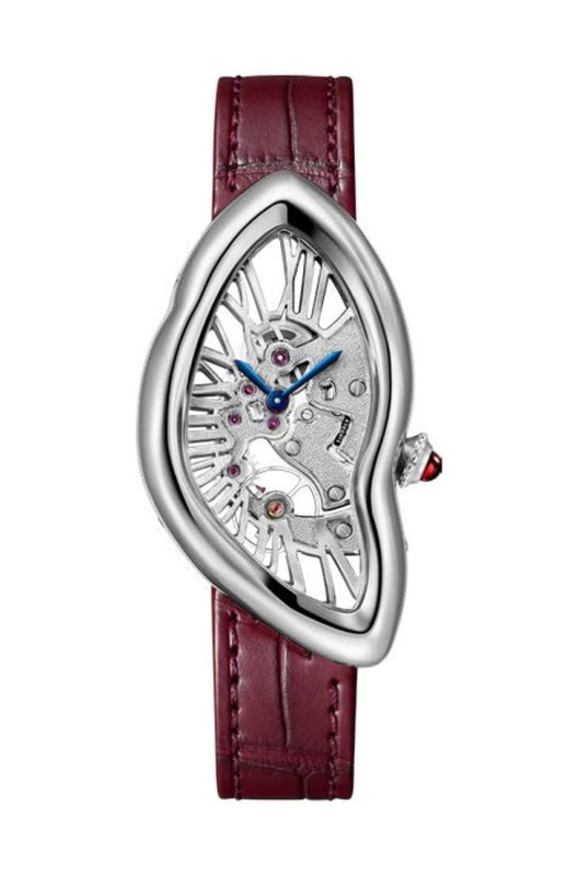Privé系列一直是卡地亞對資深藏家的回應,今年來到第十個篇章,選擇了三個最具代表性的造型:Tank Normale、Tortue單按把計時,以及Crash。手錶統一使用鉑金與酒紅色元素,是這一系列最鮮明的識別,搭配紅寶石錶冠、酒紅色錶帶與印刷細節,與銀色面盤形成強烈對比,但又不會過於張揚。其中Tortue計時錶搭載1928 MC單按把機芯,厚度僅4.3mm,極致纖薄、Tank Normale則用七排鍊節重現歷史版本的佩戴感。然而真正的主角,還是Crash鏤空錶,這款誕生於1967年的設計,本來就已經顛覆傳統,而這次的鏤空版本,更是把瘋狂推到極致,全新1967 MC機芯被塞進不規則錶殼中,羅馬數字直接變成結構橋板,每一只都需要手工錘製。