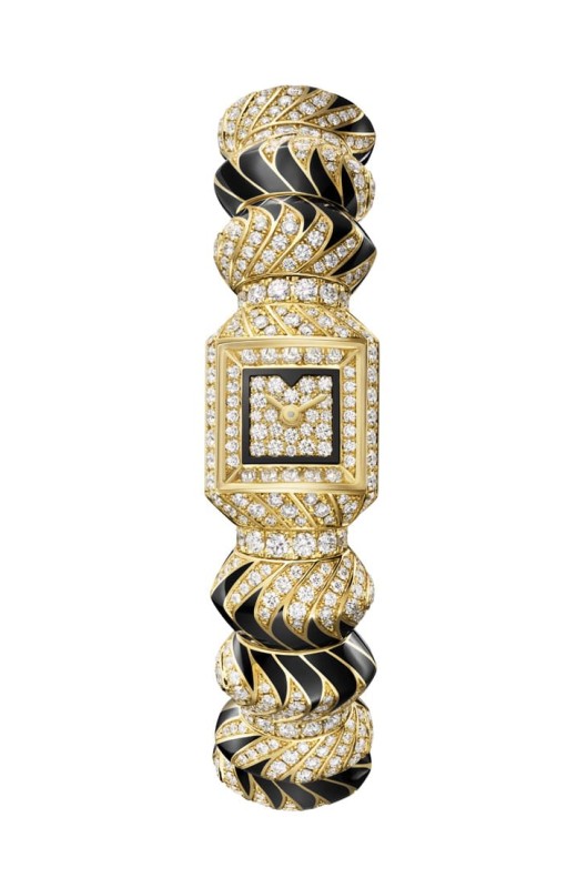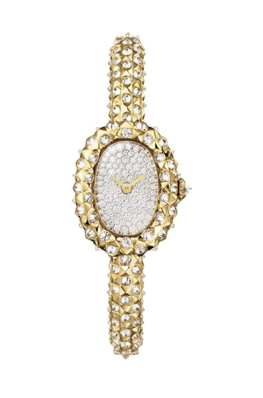18K黃金材質/石英機芯/時、分顯示/錶殼、鍊帶鑲鑽634顆,約重6.13克拉,真漆面盤鑲鑽47顆,約重0.35克拉/藍寶石水晶鏡面/防水30米/錶徑19.7x15.4mm