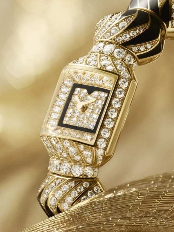 如果要選一個「最不像手錶」的系列,那一定是Myst de Cartier,這款作品幾乎放棄了傳統手錶的所有邏輯,沒有明顯錶扣,而是用彈性串珠結構直接套入手腕,整體更像一件雕塑,而不是計時工具。設計上,大量運用幾何對比,三角形時標、圓弧錶鏡、縞瑪瑙邊框,讓視覺始終處於張力之中。最高版本鑲嵌近千顆鑽石,透過四粒紋鑲嵌創造出立體層次,隨著角度改變,光線像在流動。這種作品的重點從來不是「看時間」,而是「看見時間」。