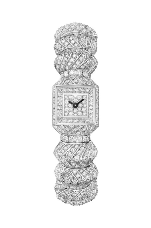 鉑金材質/430 MC手動上鍊機芯/時、分顯示/扭索雕紋面盤/錶圈鑲鑽46顆,約重2.7克拉、錶扣鑲鑽32顆,約重0.63克拉/藍寶石水晶鏡面/防水30米/錶徑41x33mm