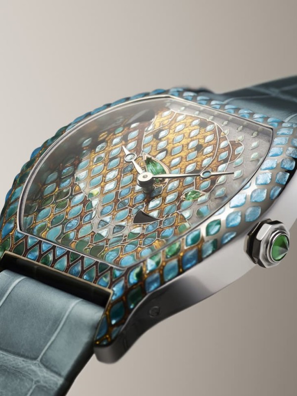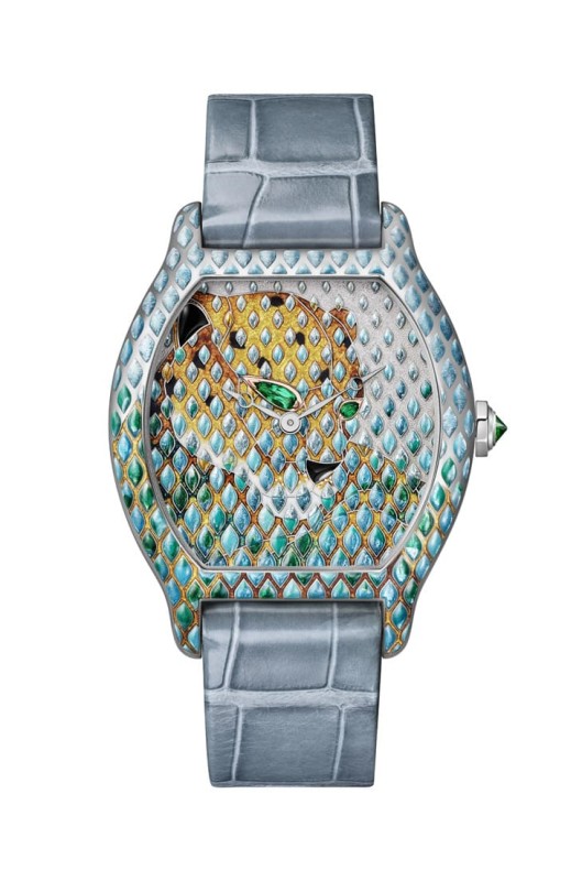 高級版本完全走向珠寶藝術,晚宴款鋪鑲梯形鑽石,搭配倒置圓鑽錶冠,整體閃耀但不俗氣,而Tortue Panthère工藝錶,更是把內填琺瑯推到極致,超過36次燒製、15種色調,讓一隻靜止的美洲豹看起來像真的在雨中呼吸,這已經不是手錶,而是微型藝術品。